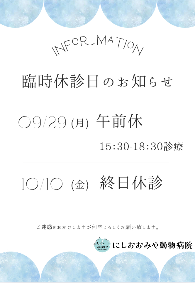 9月29日午前は臨時休診となります。午後は15時半より診察します。