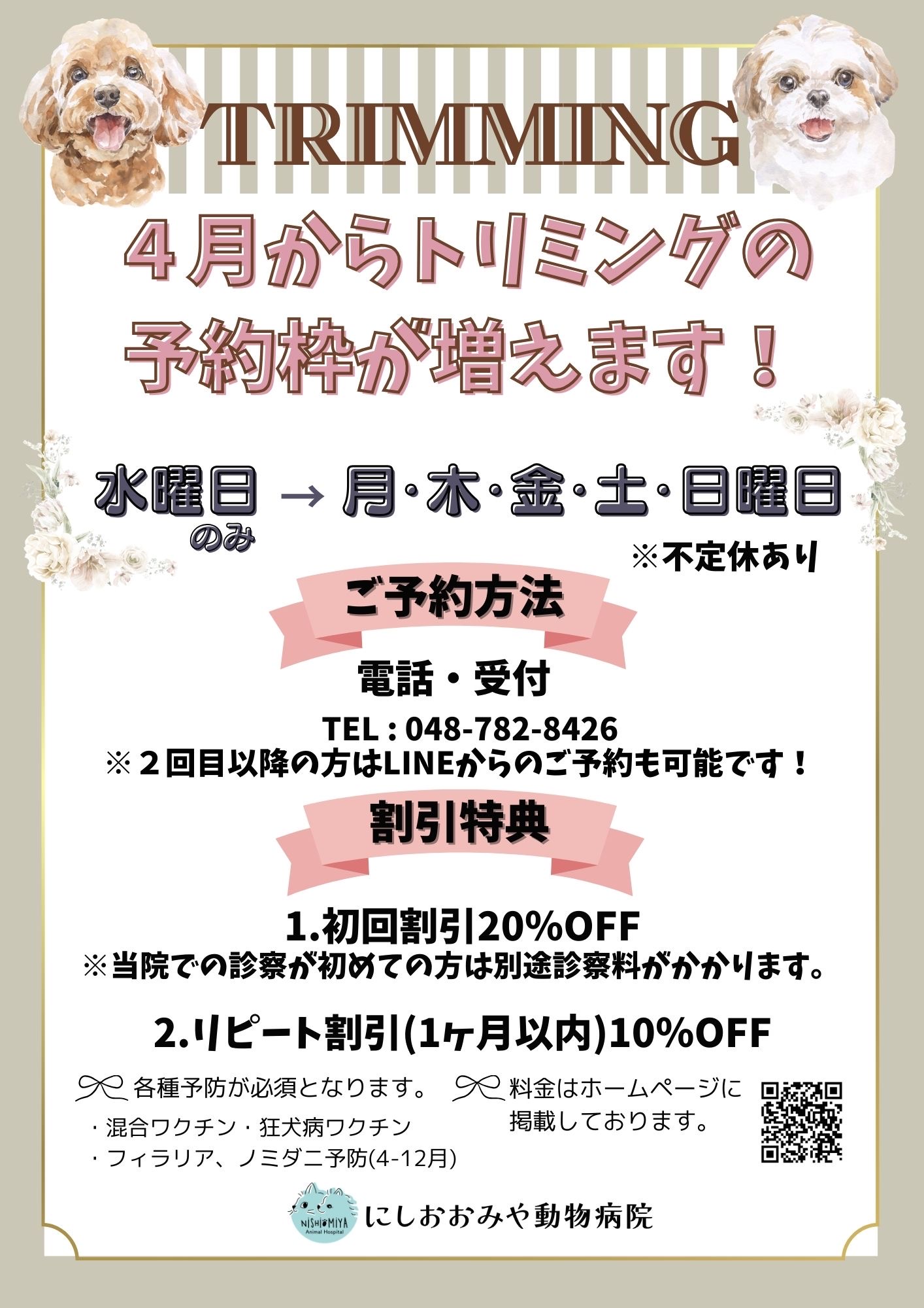 現在トリミングは水曜のみで予約が取りにくい状況でしたが、
